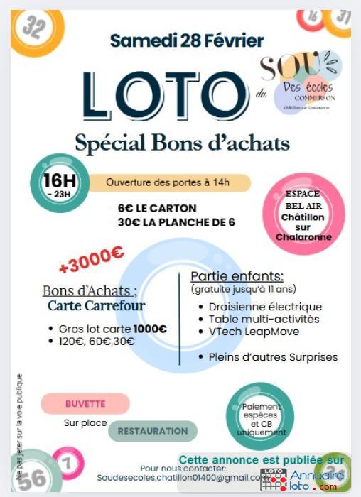 Loto organisé par le Sou des écoles Commerson de Châtillon-sur-chalaronne.