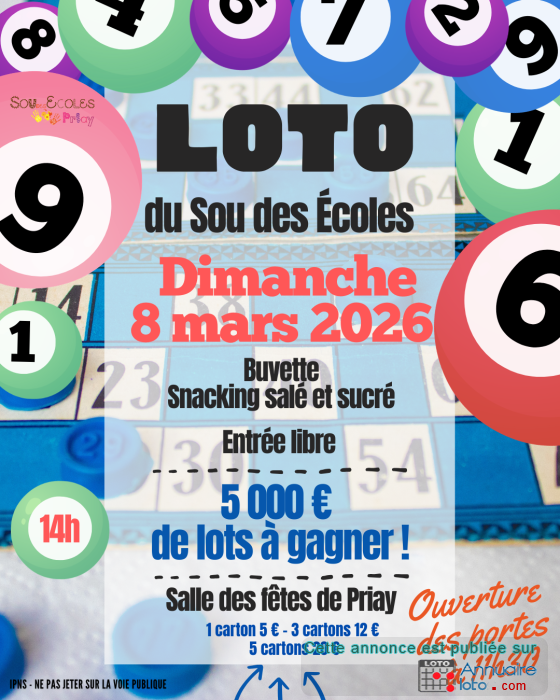 Nous avons le plaisir de vous inviter à participer au loto organisé par le Sou des écoles, qui se tiendra le dimanche 8 mars. Venez tenter votre chance et passer un moment agréable en famille ou entre amis !