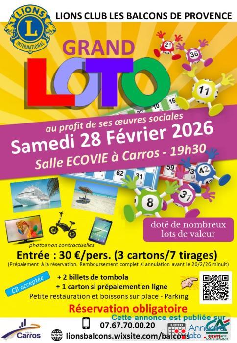 C'est le grand Loto annuel du Lions Club Les Balcons de Provence au bénéfice de ses œuvres sociales. Il est doté d'un grand nombre de lots (croisière, séjour en Corse d'une semaine, repas, soins, TV, sorties, etc...). Le Loto comprends 6 tours de 3 tirages chacun et un tour des mendiants. Une tombola complémentera le loto. Venez passer une bonne soirée, dans une bonne ambiance et gagner des lots tout en aidant les autres. Un snack/bar proposera boissons et nourriture (sandwiches, pizzas, tartes, ...).