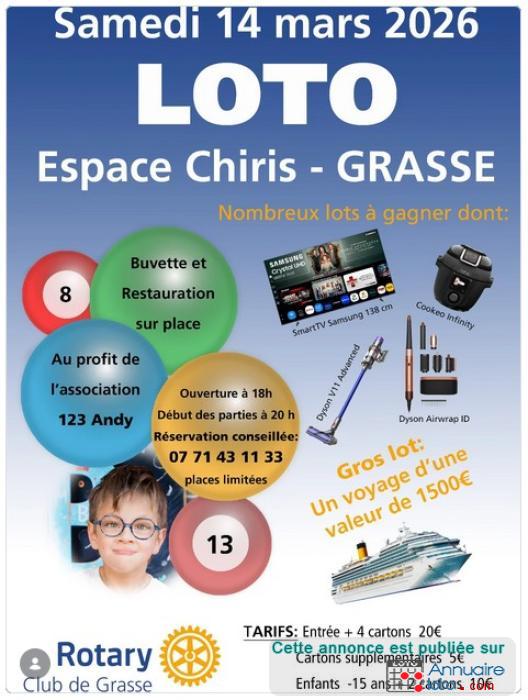 Le Rotary Club de Grasse organise son premier Loto Solidaire au profit de l’association 123 Andy, qui accompagne Andy, 4 ans, atteint d’une maladie génétique très rare (ataxie cérébelleuse et TSA). L’objectif est de récolter des fonds pour financer ses soins, ses thérapies et son matériel adapté, afin de l’aider à gagner en autonomie.