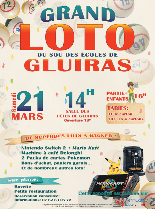 Grand loto du Sou des Ecoles de Gluiras dans le but de financer un voyage scolaire.