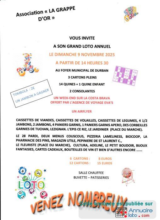 SUPER GRAND LOTO ORGANISE PAR LA GRAPPE D'OR DE DURBAN, CE LOTO EST OUVERT A TOUS. NOMBREUX LOTS ETC....