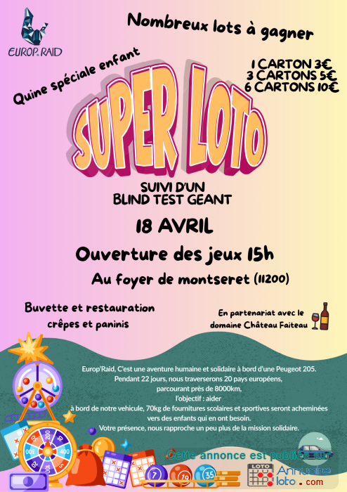 Nous organisons un loto solidaire pour financer notre participation à l’Europ’Raid : un raid à travers l’Europe au cours duquel nous transporterons 70 kg de fournitures scolaires pour les distribuer à des écoles. En venant jouer, vous nous aidez directement à réaliser ce projet solidaire… et vous pourriez repartir avec de super lots !