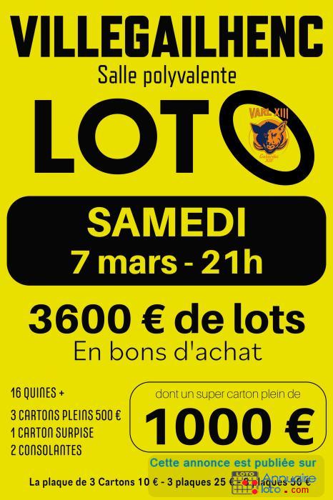 Villegailhenc Aragon rugby league (VARL) organise un loto le samedi 7 mars (21h) avec 3600 € de lots en bons d’achat.