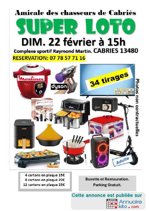 Super LOTO à Cabriès Dim 22 février 2026 à 15h. Salle d'Armes Complexe sportif Raymond Martin 13480.. Avenue Raymond MARTIN.Amicale des chasseurs de Cabriés