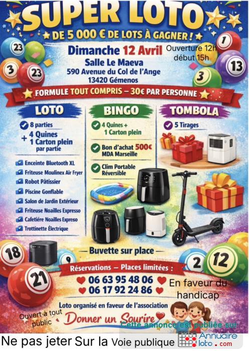 Super loto de l association donner en sourire avec plus de 5000 euro de lots ouvert à tous en faveur du handicap