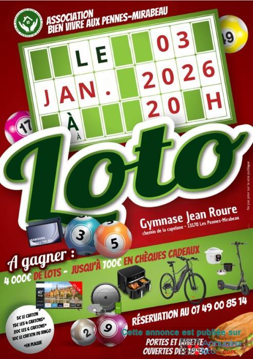 Méga loto le 3 janvier 2026 Gymnase Jean Roure: 4000€ de lots jusqu'à 700€ en chèques cadeaux pour le Bingo.