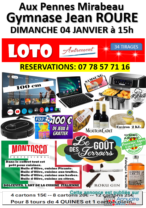 Robot aspirateur connecté, Friteuse Kitchen Cook, Tablette wifi 10 pouces avec clavier, smartphone galaxie Samsung, Téléviseur HD 100 cm, pochette avec 100€ de grattage, coffret culinaire Italien MONTESCO la dolce Vita, (huile d’olive, truffe, épices de Sicile). Vodka japonaise ROKU, Rhum Marseillais FERONNI, Vin rouge Mouton Cadet, jambon cru 5 kl, tome du Massif central environ 2 kl, sucrerie de MENTON, coffret gourmand, Panettone 1 kl, ASTUCI et MOTTA. Etc…