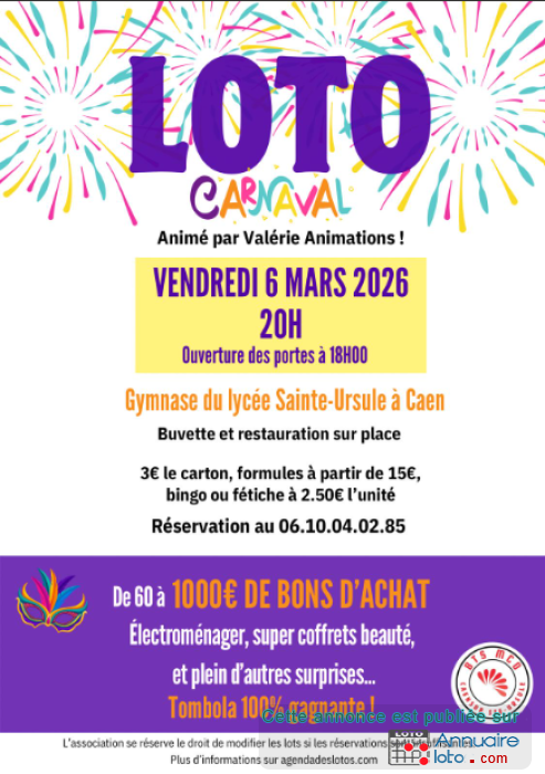 De nombreux lots sont à gagner dont des bons d'achat allant de 60€ à 1000€. Ouverture des portes à 18h00 début du loto 20h00. Buvette et restauration sur place.
