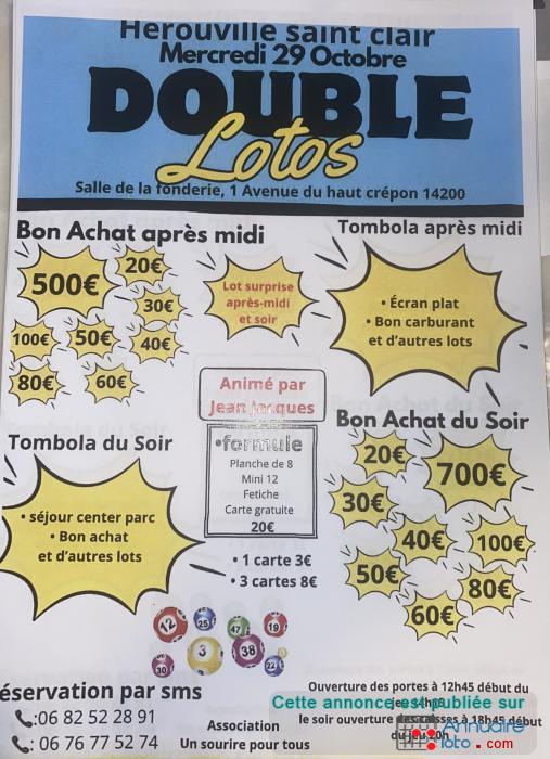 Double Loto, spécial, bon d’achat un bon d’achat de 700,01 € bon d’achat de 500 € des bons d’achat de 100 €, 80 € une magnifique tombola avec un séjour Center, parcs et écran, plat bon de carburant, bon d’achat et d’autres lots. N’hésitez pas à réserver.