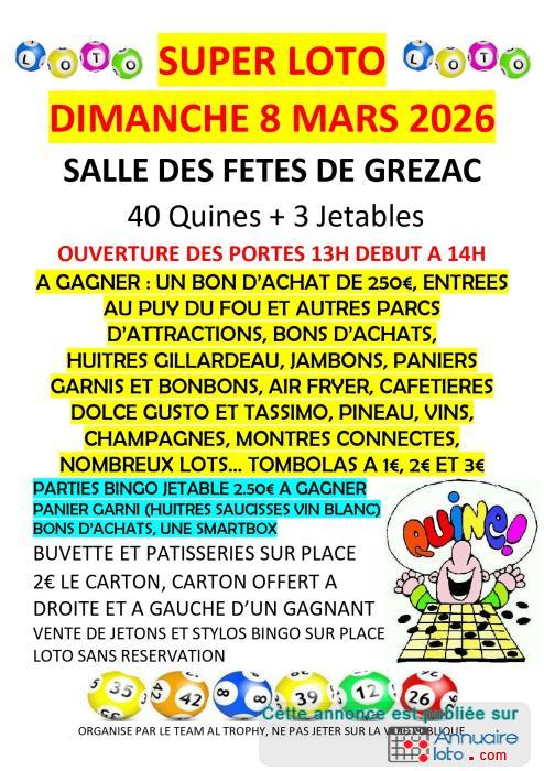 a gagner : un bon d’achat de 250€, entrées au puy du fou et autres parcs d’attractions, bons d’achats, huitres gillardeau, jambons, paniers garnis et bonbons, air fryer, cafetières dolce gusto et tassimo, pineau, vins, champagnes, montres connectes, nombreux lots… tombolas a 1€, 2€ et 3€ parties bingo jetable 2.50€ a gagner panier garni (huitres saucisses vin blanc) bons d’achats, une smartbox