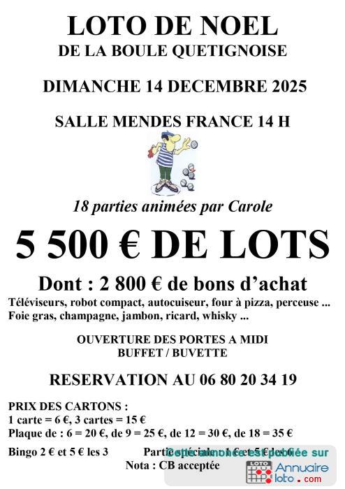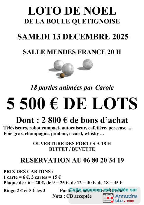 Super Loto de Noël de la Boule Quétignoise pour 5 500 € en 18 parties animé par Carole