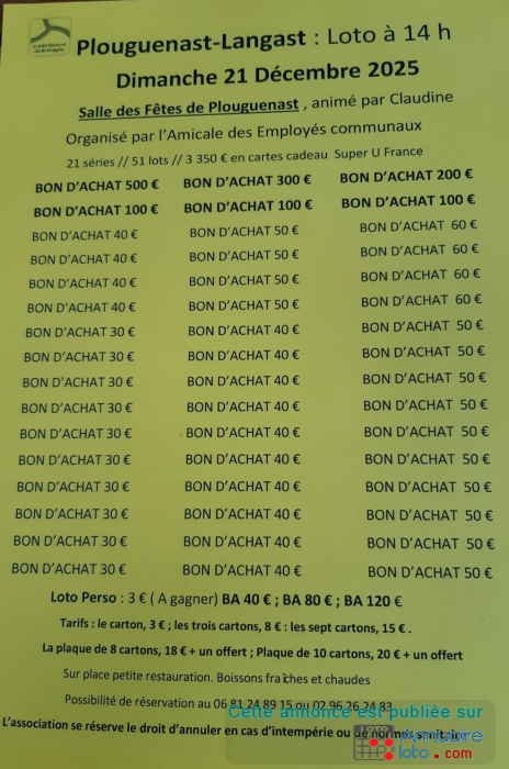 Loto à 14h00 à la salle des Fêtes de PLOUGUENAST le dimanche 21 décembre 2025