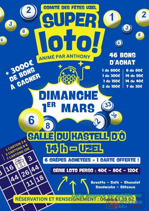 Le Comité des Fêtes - Uzel organise son Super Loto, 🎤animé par Anthony. Venez passer un agréable après-midi convivial, rire un peu et tenter votre chance ! 🎁🙌