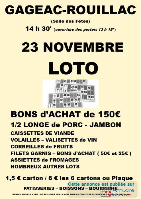 Le comité des loisirs de Gageac et Rouillac organise un Loto le dimanche 16 Mars à partir
