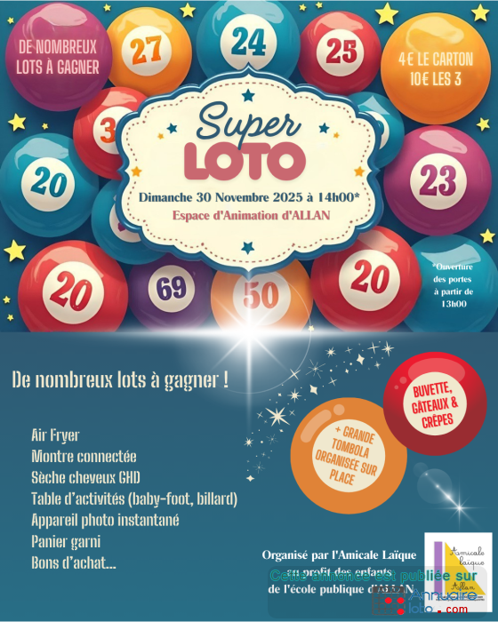 Loto organisé par l'amicale laique de l'école publique d'Allan. Les bénéfices seront utilisés pour les sorties, les transports et les voyages scolaires des enfants de l'école.