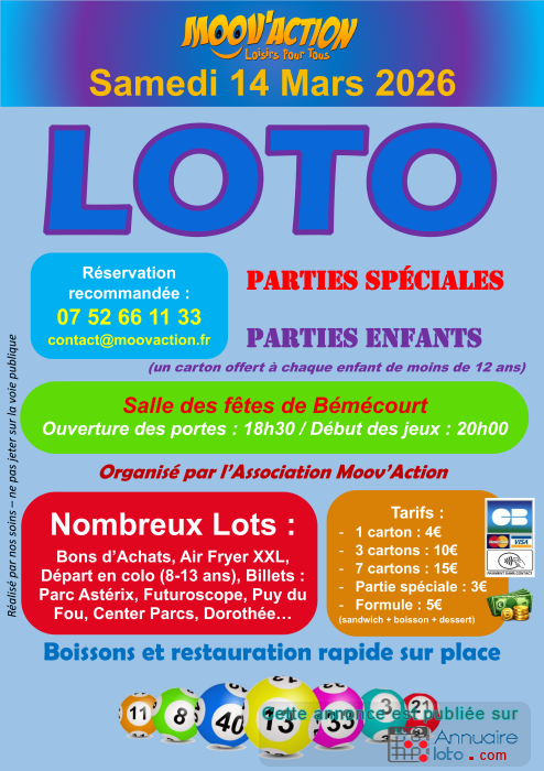 Nous vous donnons rendez-vous le samedi 14 mars pour notre grand loto à la Salle des Fêtes de Bémécourt !