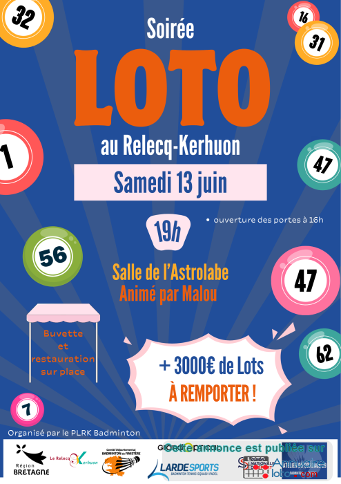 Nous vous invitons à notre loto le samedi 13 juin 2026 à 19h à la salle de l'astrolabe au Relecq-Kerhuon. Il sera animé par Malou. Plus de 3000€ de lots à gagner. Ouverture des portes à partir de 16h. Pas de réservation possible.
