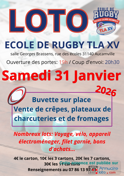 Le 31 janvier, l’école de rugby organise un loto ouvert à tous. Cet événement s’inscrit dans les actions menées par l’association afin de soutenir ses activités tout au long de l’année. Les bénéfices réalisés seront utilisés pour contribuer au financement du voyage de fin d’année des enfants, ainsi que pour répondre aux besoins de fonctionnement de l’association, notamment en matière de matériel et d’organisation des activités sportives.
