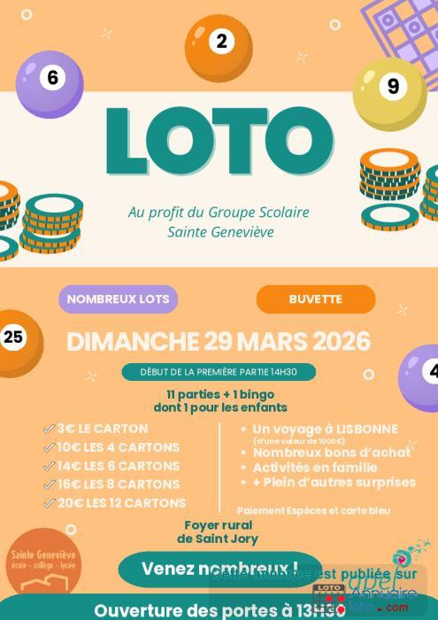 L'association des parents d'élèves de l'établissement Sainte Geneviève vous invite à son grand loto . Venez passer un moment convivial et repartez peut-être avec l'un de nos superbes cadeaux
