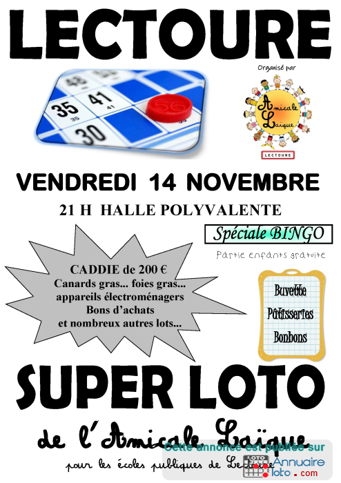 Super loto de l'Amicale laïque dont les bénéfices seront reversés aux écoles publiques de lectoure afin de financer leurs projets et sorties pédagogiques.