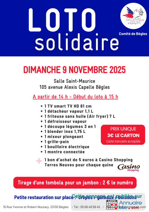 Le comité de Bègles du Secours Populaire vous invite à participer à son loto solidaire de printemps, le 16 mai 2025 à 20h00 (ouverture des portes à 18h30). Buvette et petite restauration. Réservation possible au 0631050591 ou 0623154156.