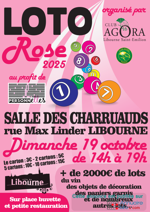A l’occasion d’octobre rose, le club Agora 16 organise une action locale dont l’ensemble des bénéfices est reversé à cette association locale. Pour cela nous avons récolté auprès de commerçant.e.s et artisan.e.s locaux des lots qui sont à gagner lors du LOTO ROSE le 19 octobre 2025 salle des Charruauds à Libourne.