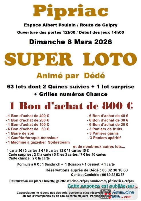 Super LOTO: animé par "Loto Dédé" et organisé par la Confrérie Piperia la Galette