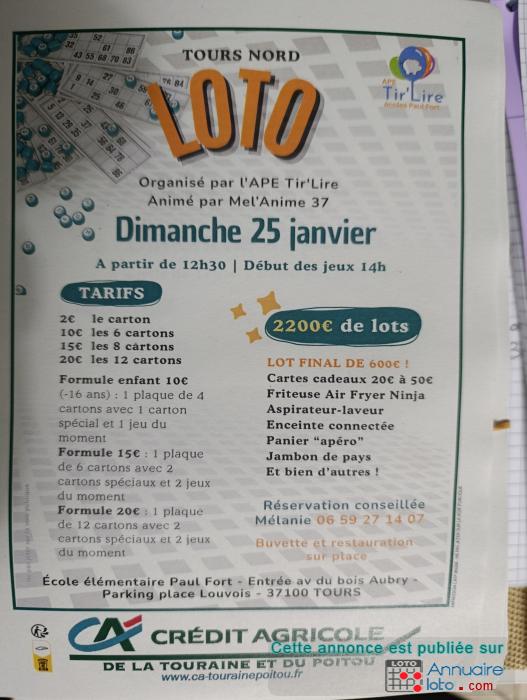 SUPER LOTO DE L'ASSOCIATION APE TIR'LIRE DE L'ECOLE PAUL FORT