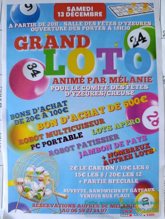 SUPER LOTO DU COMITE DES FETES D'YZEURES SUR CREUSE ANIME PAR MELANIE RESERVATION A MELANIE 06.59.27.14.07