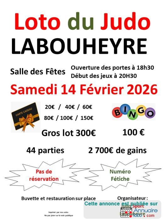 JUDO SPORT LABOUHEYRE organise un Loto avec Numéro fétiche + Bingo : Samedi 14 Février 2026 - 20H30 à la salle des fêtes de LABOUHEYRE.