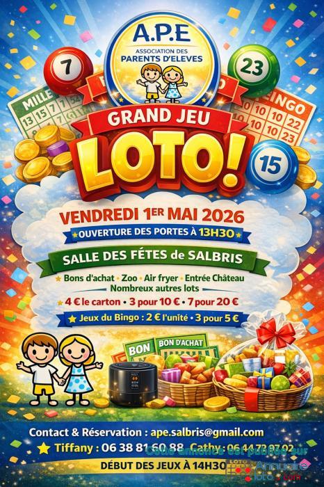 Grand loto familial de l’APE Salbris avec de nombreux lots à gagner dans une ambiance conviviale.