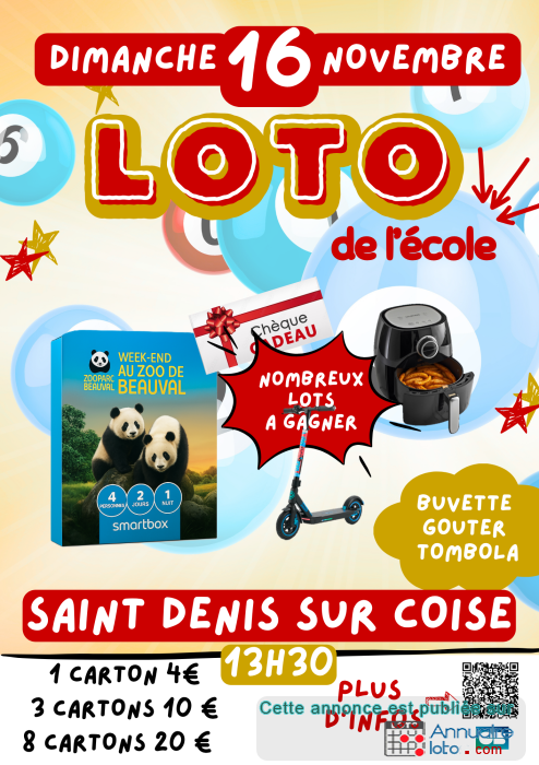🎉 Venez tenter votre chance au loto de l’école de Saint-Denis-sur-Coise : un après-midi plein de rires, de suspense et de super lots à gagner !