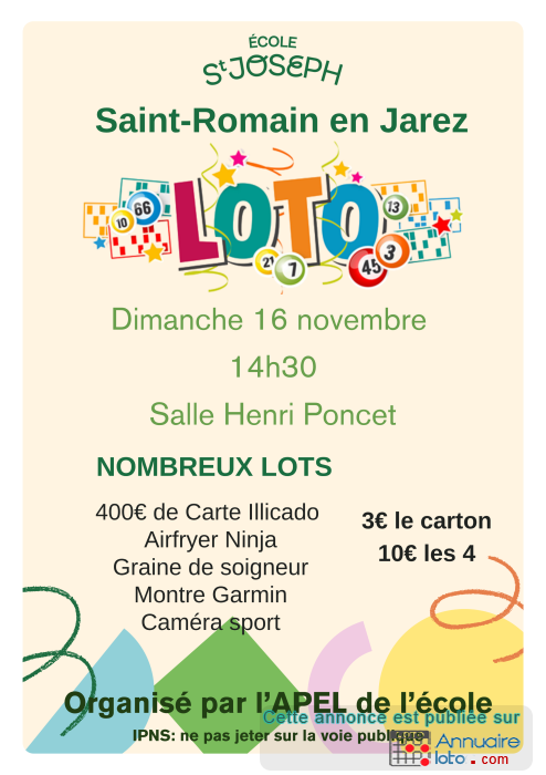 Loto organisé par l'APEL de l'école privée St Joseph à ST ROMAIN EN JAREZ.