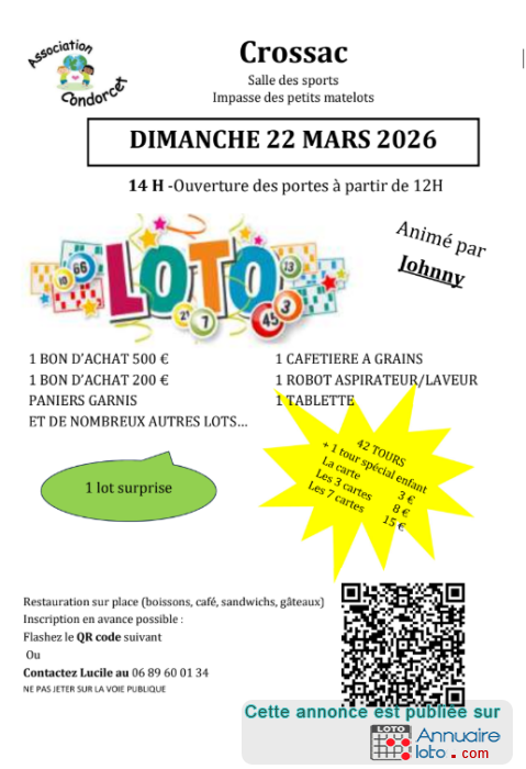 Loto organisé part l'association des parents d'élèves de l'école Condorcet de Crossac.