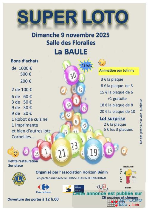 Super loto organisé par l'association Horizon Bénin (au bénéfice d'un orphelinat au Bénin) en partenariat avec le Lions-Club de Pornichet, ce super loto se tiendra Salle des Floralies, Place des Salines, Avenue des Floralies à La Baule Escoublac.