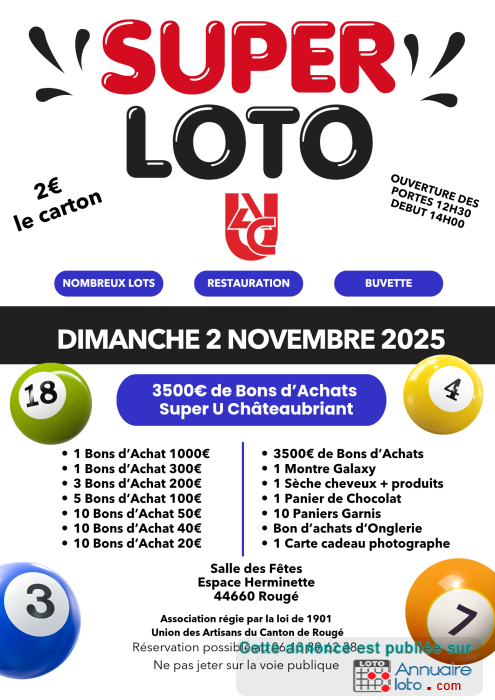Super loto de 3500€de bon d'achat et plein de lots Buvette et restauration sur place