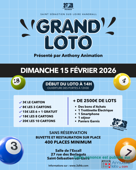 Rendez-vous le dimanche 15 février 2026 pour participer à notre Grand Loto animé par Anthony Animation à la salle de l'Escall à Saint-Sébastien.