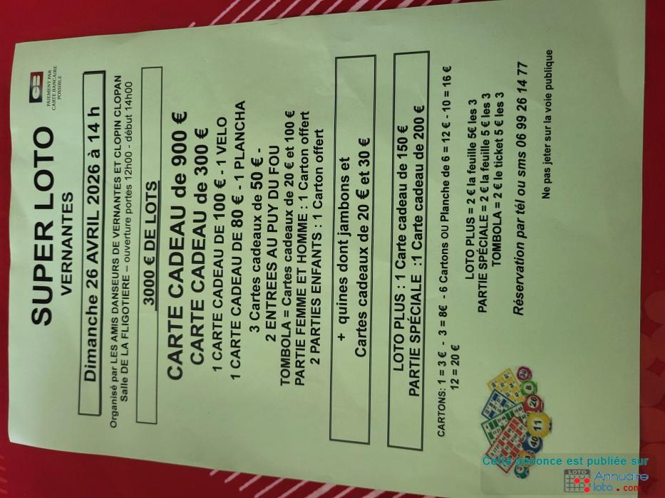 Les Amis Danseurs de Vernantes et Clopin Clopan organisent un Super Lotot le 26 Avril