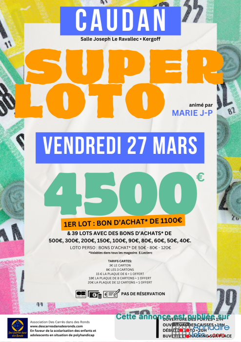 L'association des Carrés dans des Ronds vous donne rendez-vous à Caudan le vendredi 27 mars 2026 un SUPER LOTO avec plus de 4500 € de lots !
