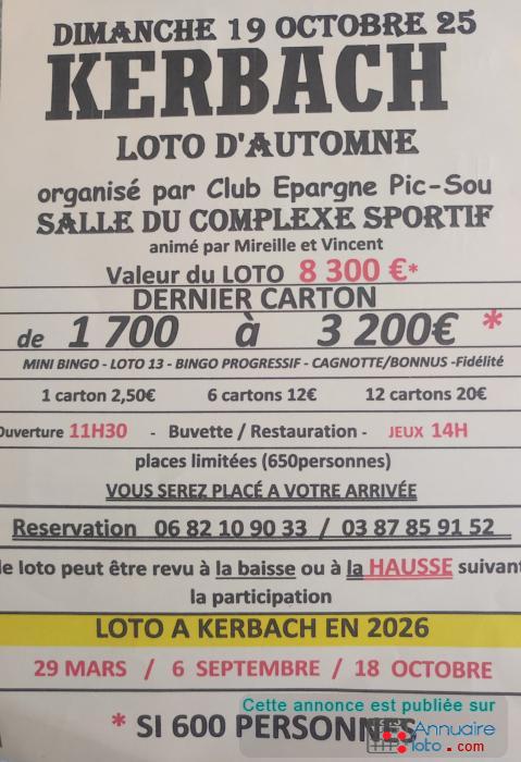 Grand LOTO d’Automne spécial bons d'achats le 19 Octobre à Kerbach animé par MIREILLE et Vincent Réservation conseillée 0682109033