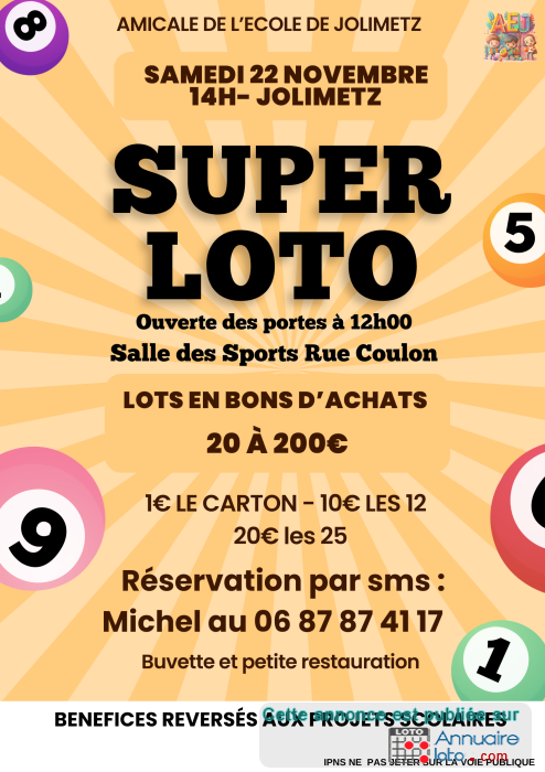 Loto à partir de 14h salle des Sports Rue Coulon à Jolimetz.