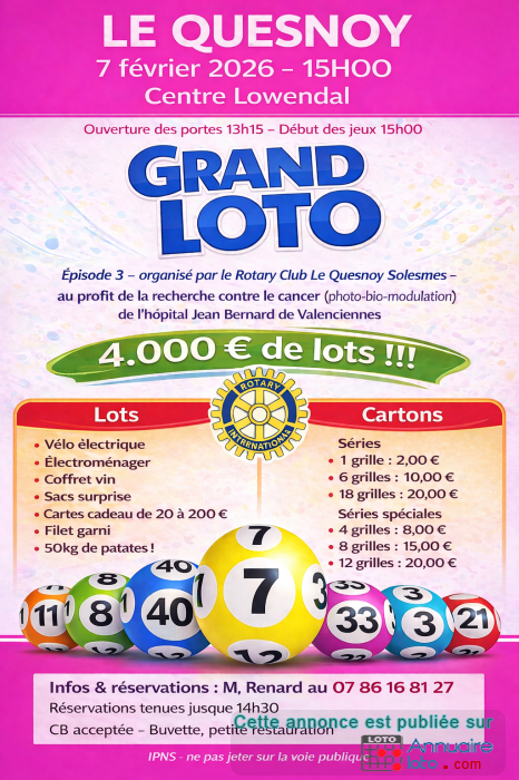 3ème édition du loto organisé par le Rotary Club de Le Quesnoy Solesmes, au profit de la recherche contre le cancer menée à l’hôpital Jean Bernard de Valenciennes.