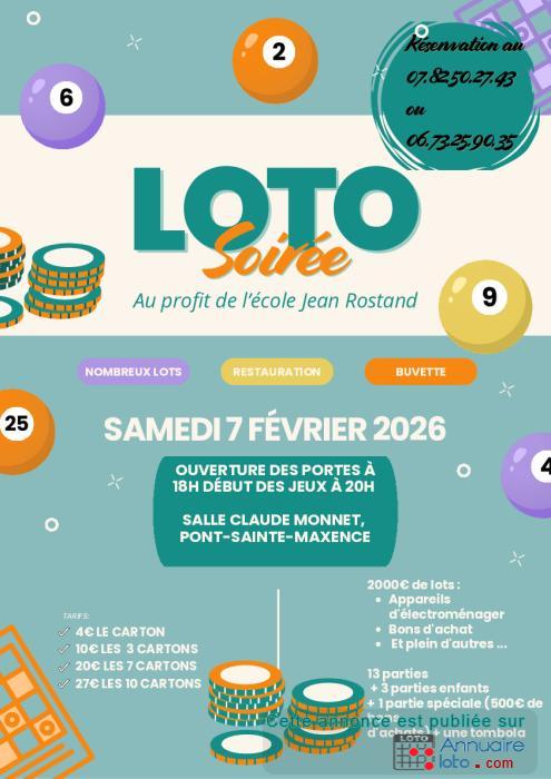 Venez passer une soirée conviviale et solidaire à l’occasion du grand loto de l’école Jean Rostand, le samedi 7 février 2026 à la Salle Claude Monnet, Pont-Sainte-Maxence.