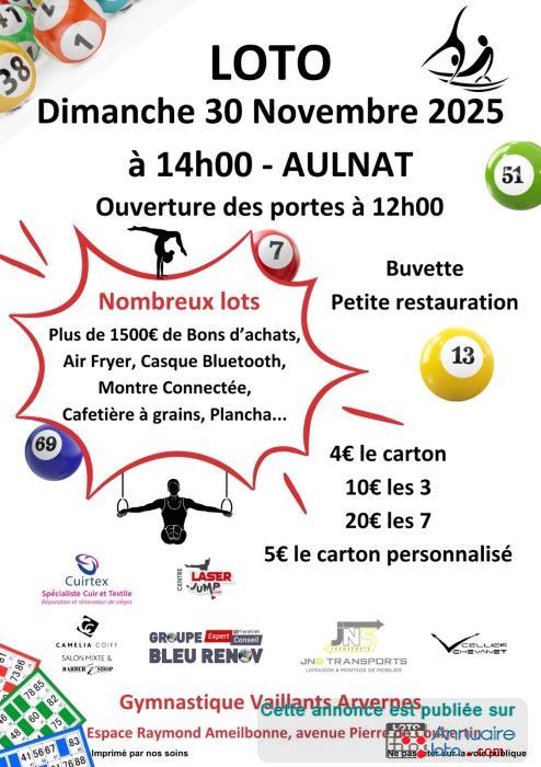 Les Vaillants Arvernes, club de gymnastique d’Aulnat, organisent leur GRAND LOTO 2025.