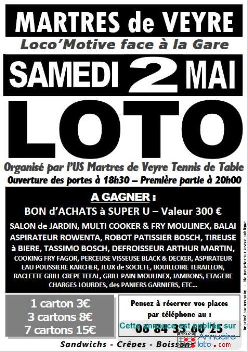Loto du Tennis de Table le 02 Mai 2026 à 20h à la Salle des fêtes La locomotive (Face à la Gare des Martres de Veyre).