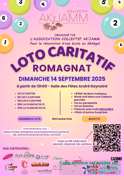 Le Collectif Ak'jamm, association reconnue d’intérêt général et engagée dans un projet humanitaire de rénovation d’une école au Sénégal, organise un loto caritatif à Romagnat.