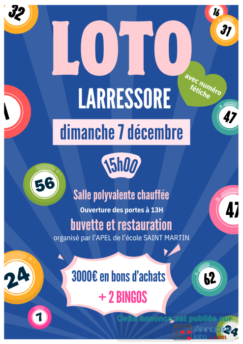 Rendez-vous le Dimanche 7 Décembre 2025 à la salle chauffée de Larressore. Ouverture des portes à 13h, début du loto à 15h. Tentez votre chance pour gagner jusqu’à **3000€ en bons d’achat** !
