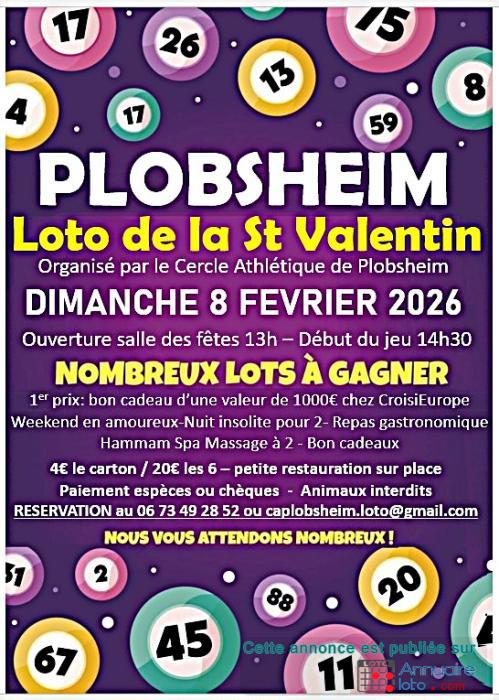 Loto Spécial St Valentin à la salle des fêtes de Plobsheim le 08 février 2026 à 14h30.