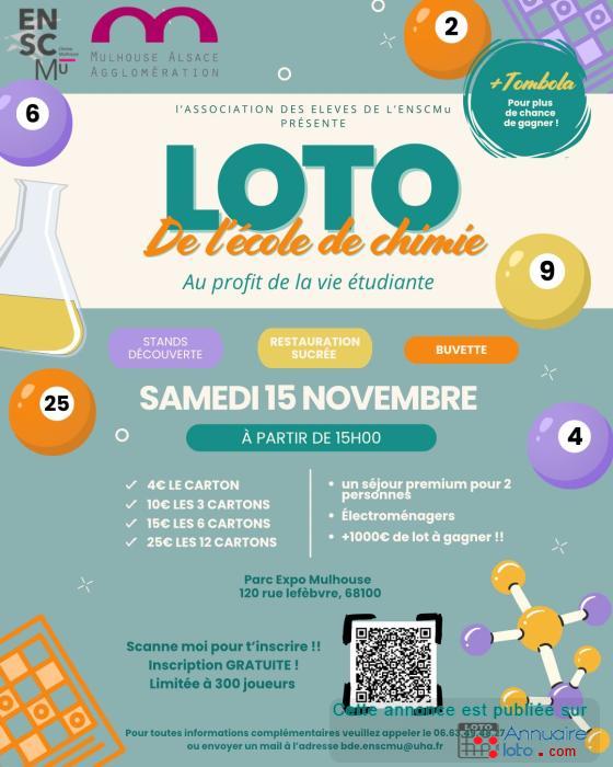 Loto organisé par le Bureau Des Élèves de l'ENSCMu (École Nationale Supérieure de Chimie de Mulhouse). Venez passer un agréable moment en compagnie des élèves de l'école. Des stands de restauration et une buvette vous sera proposée. Ces stands seront tenus par les élèves eux mêmes. Ils pourront vous en dire un peu plus sur notre école, patrimoine de la ville de Mulhouse. Une tombola est aussi proposée en plus du loto.